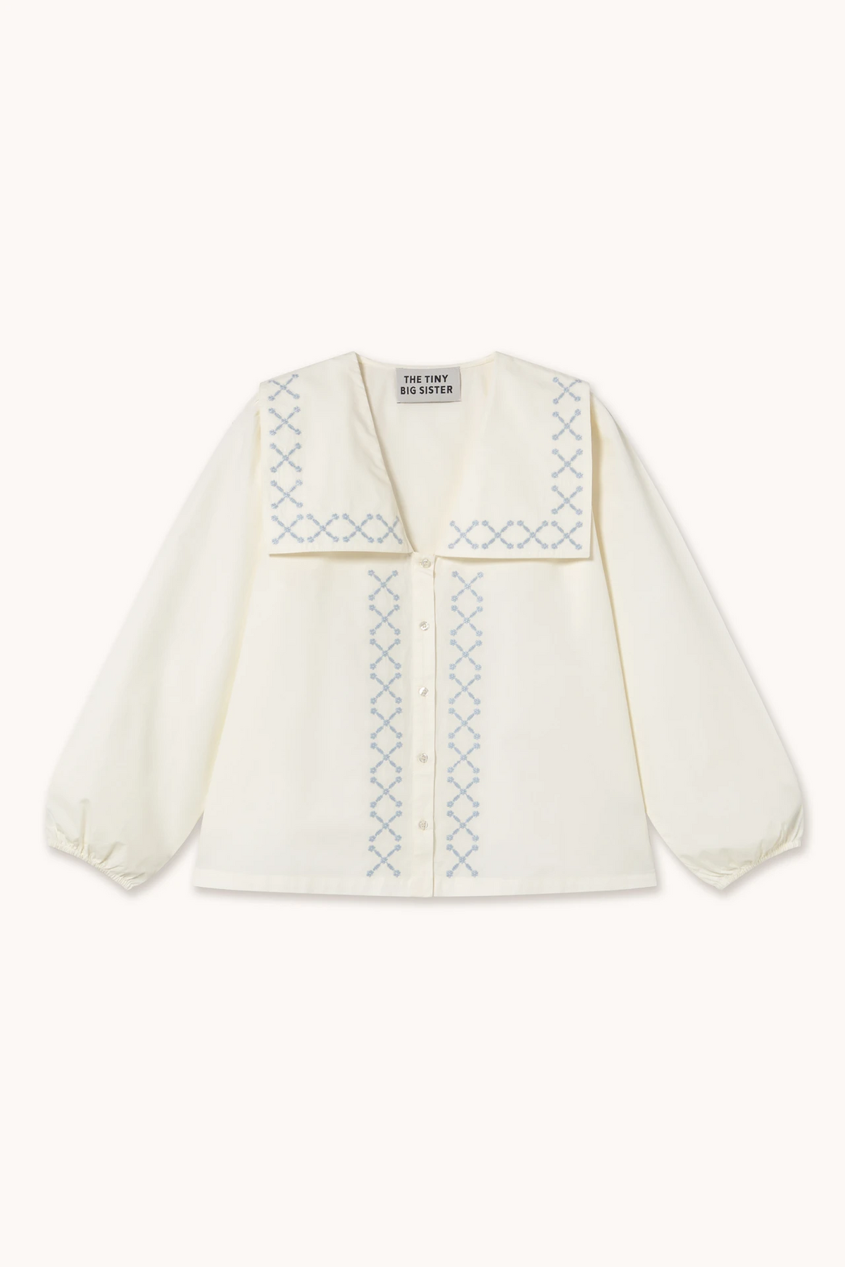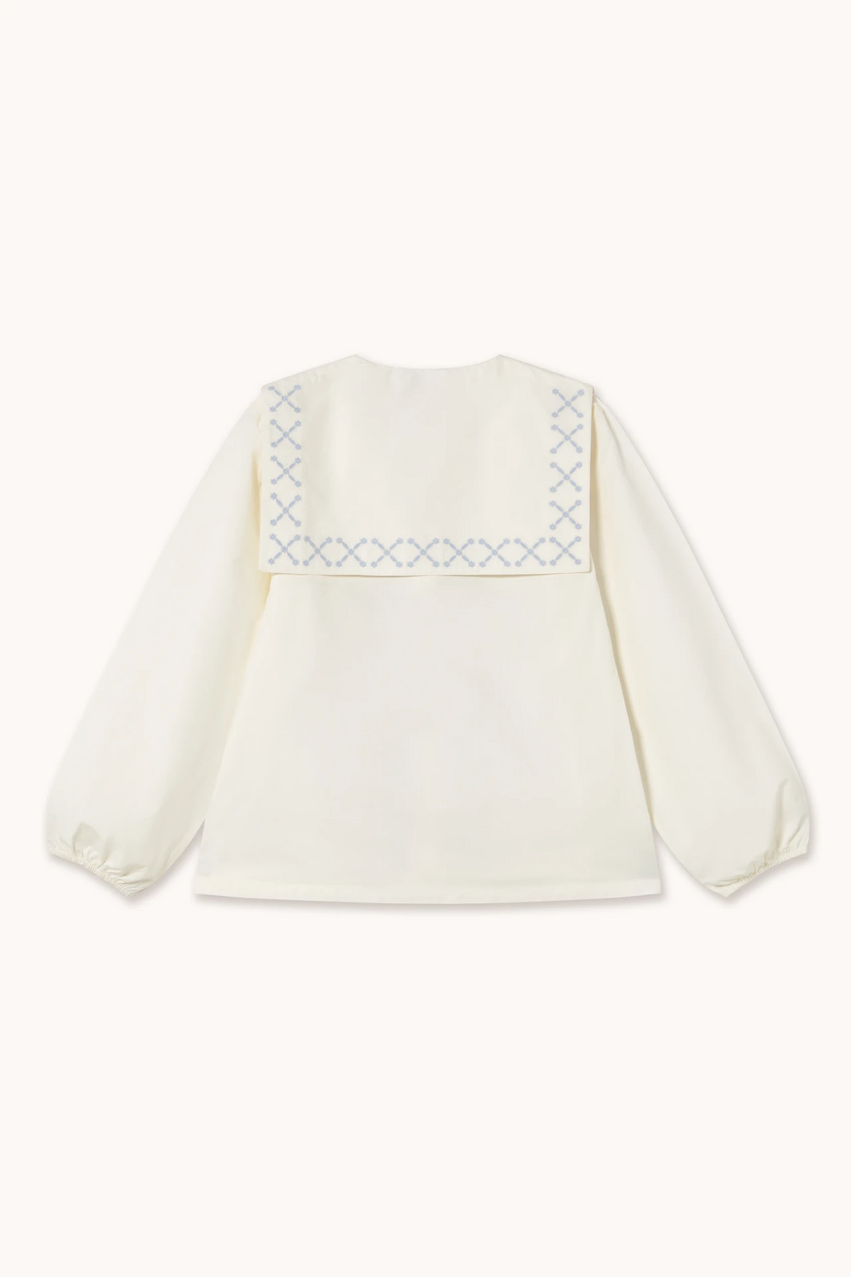 Paper-touch cotton poplin off-white pyjama set. Includes a blouse, slip-on pants, eye mask, and a matching bag designed to fit all pieces. The blouse features delicate frill details and an embroidered logo, while the pants offer a wider leg shape and adjustable waistbands.